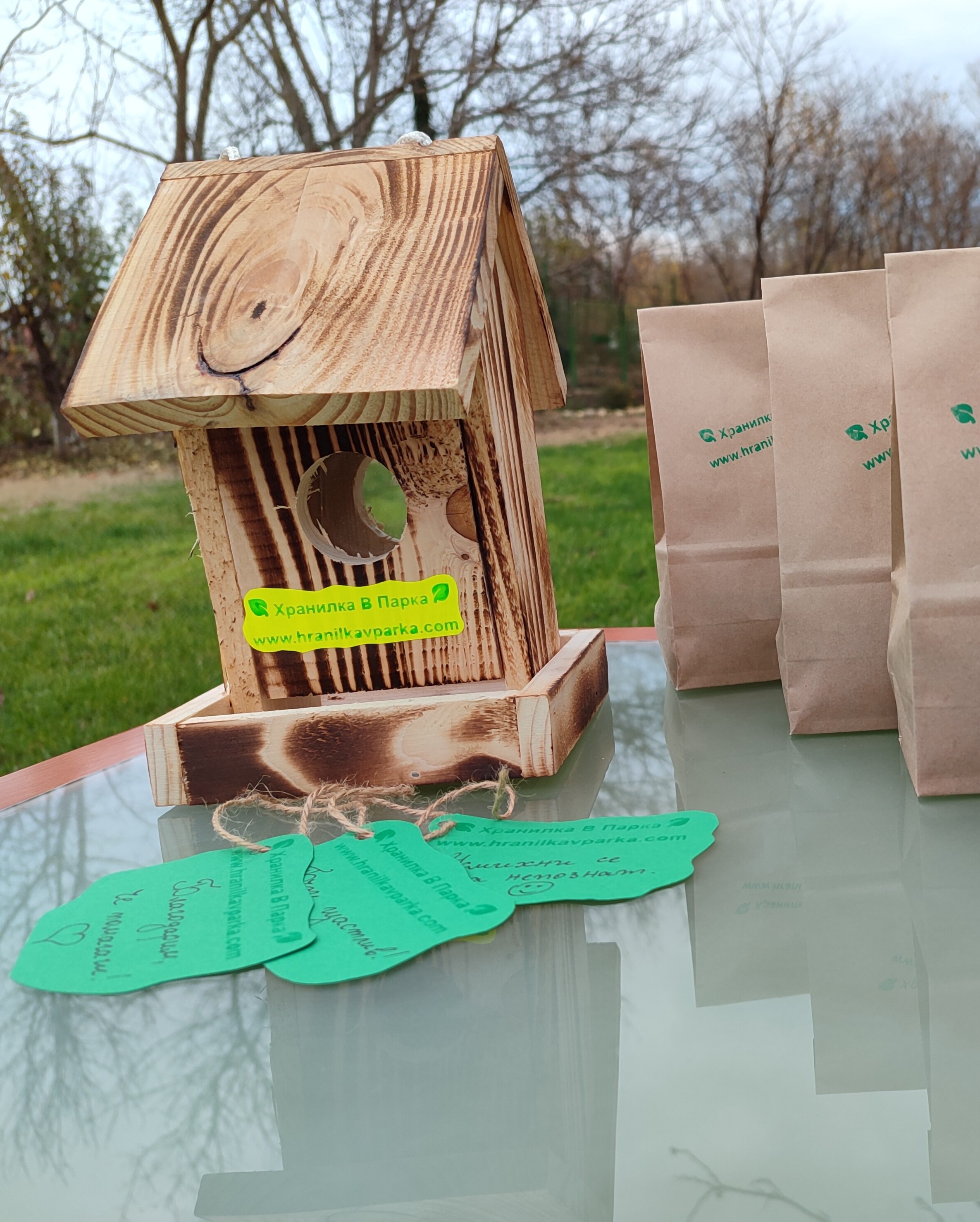 Хранилката за птички е изработена естествена дървесина от бук, смърч и/или топола. Покрива и се отваря и от там се прибавя храната. Размери 14х19х23 см. Пакетът включва и 4 пакетчета по 250 грама храна за да може лесно и удобно да я изсипвате в хранилката, без да се налага да пресипвате или носите тежки торби с вас навън, за да зареждате хранилката. Храната е смес от пресни фуражни ядки и семена, подходящи за малки диви птици.